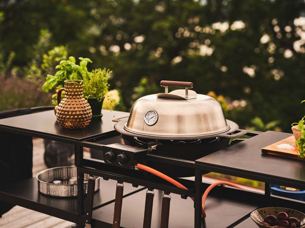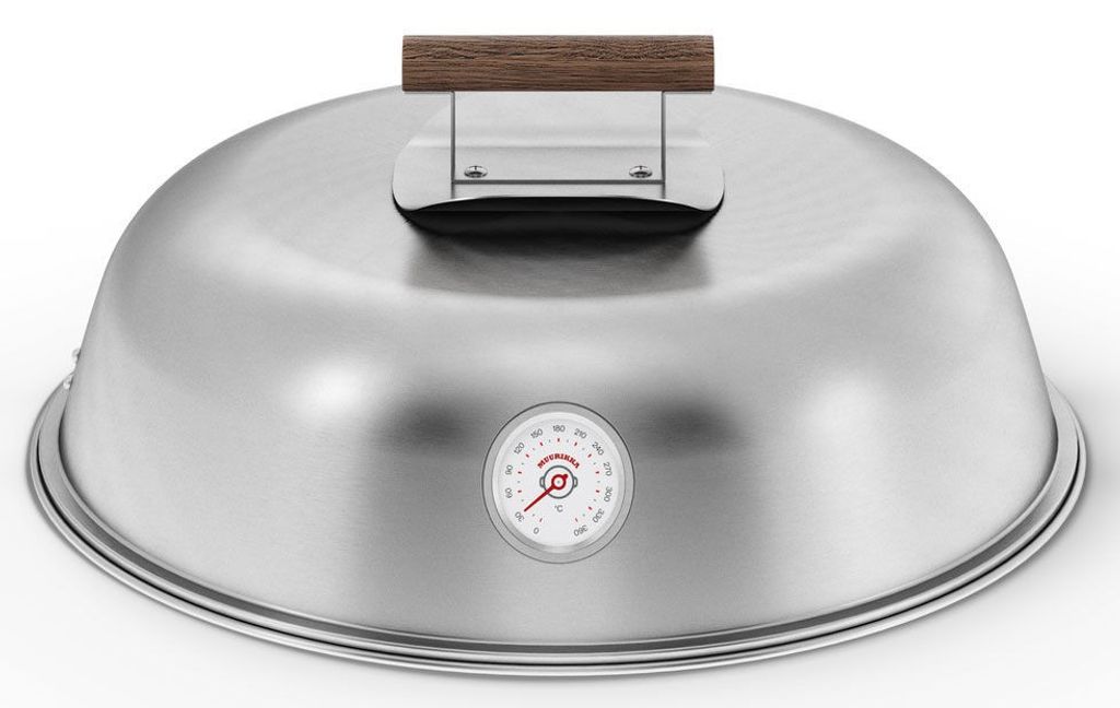 Muurikka stilfullt och praktiskt lock av rostfritt stål med trähandtag i rökt ask och integrerad termometer. Locket passar stekhällar med en diameter på 58 cm, håller maten varm längre och påskyndar tillagningen.
