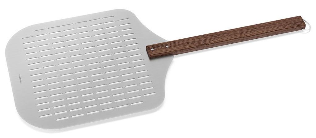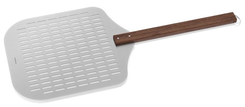 Muurikka Perforerad Pizzaspade av rostfritt stål med ergonomiskt D-format handtag i FSC-certifierat rökt ask. Längd 64 cm och bredd 30 cm. Utrustad med en praktisk upphängningsögla. Perfekt för att enkelt flytta pizzor och undvika att degen fastnar.