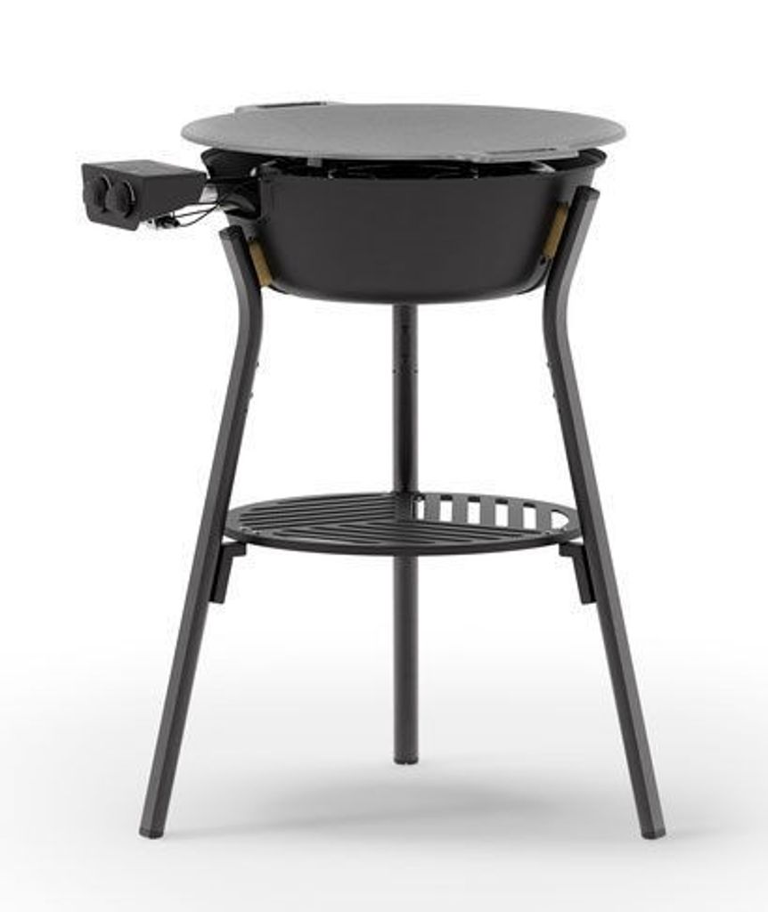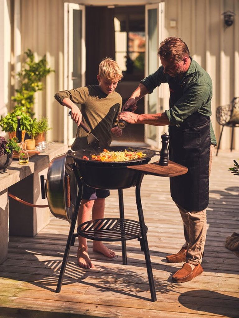 Det skålformade vindskyddet med botten skyddar effektivt lågorna från vind, vilket säkerställer jämn värmefördelning även under blåsiga förhållanden. Setet inkluderar även en praktisk hylla för förvaring av tillbehör och matlagningsredskap. För att skydda och förlänga livslängden på stekhällen rekommenderas att den förvaras torrt när den inte används.
