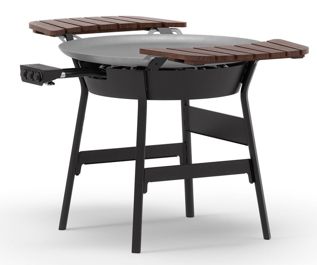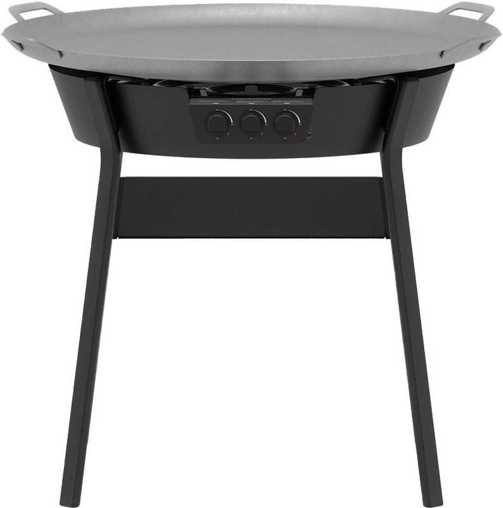 Stekhällen, med en diameter på 100 cm, är tillverkad av varmvalsat stål, vilket säkerställer hållbarhet och lång livslängd. Det stadiga stativet med långa ben i D-profil ger stabilitet under matlagningen, och det skålformade vindskyddet skyddar lågorna effektivt även under blåsiga förhållanden. Gasolbrännaren är utrustad med vred med integrerad tändning och tydliga markeringar för enkel kontroll av värmen.