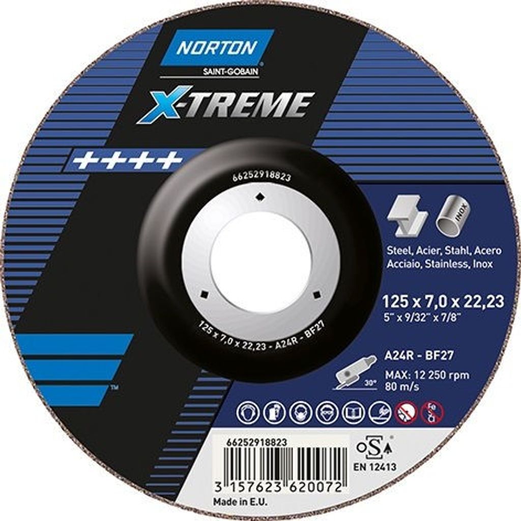 Norton X-Treme är en högpresterande navrondell för slipning av järn, stål och rostfritt. Med låg halt av järn, klor och svavel är den idealisk för rostfria applikationer. Rondellen är armerad för säkerhet och har en extremt lång livslängd i kombination med hög materialavverkning. Den är konstruerad för professionella användare som kräver både prestanda och hållbarhet. Med max periferihastighet på 80 m/s och maxvarvtal på 12 300 r/min klarar den tuffa jobb med tillförlitlighet.