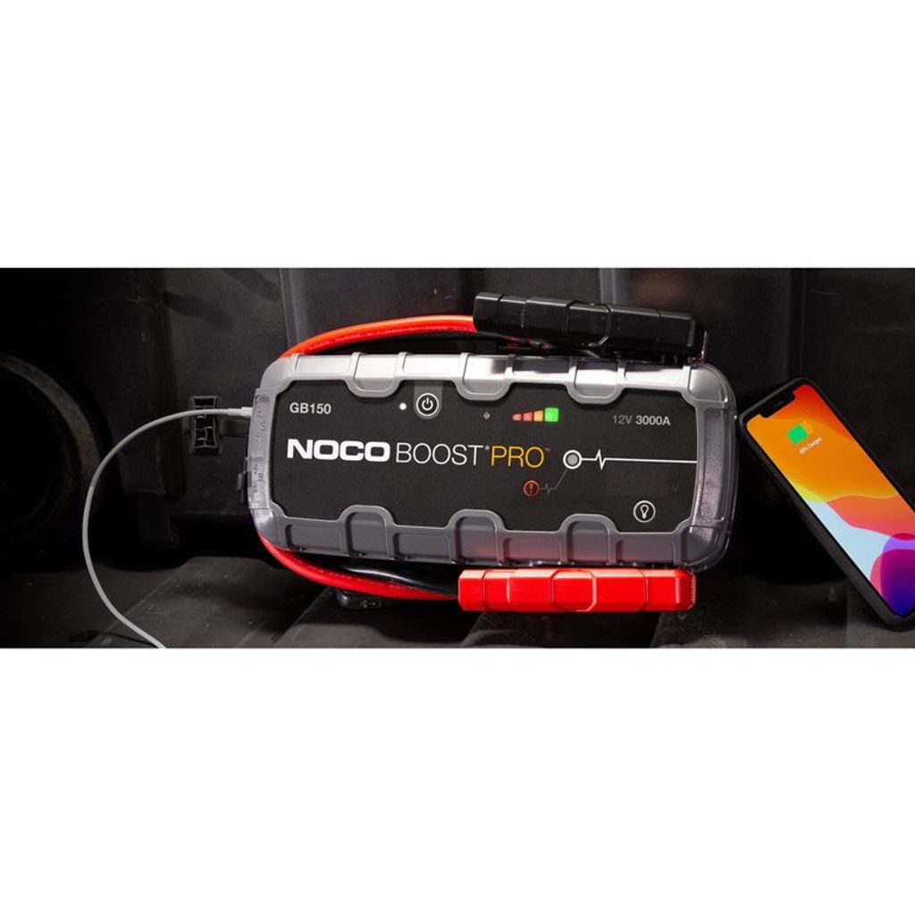 Noco GB150 Genius Boost Pro är en kraftfull, säker och mångsidig 3000A starthjälp för litiumjonbatterier, som även laddar 12V och USB-enheter och fungerar som en LED-ficklampa för nödbelysning.