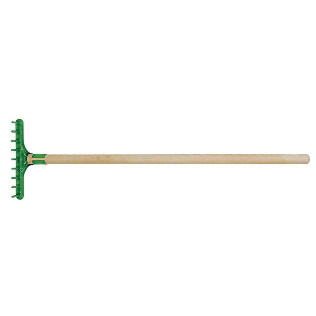 Barnkratta i grönlackerad plåt och träskaft.