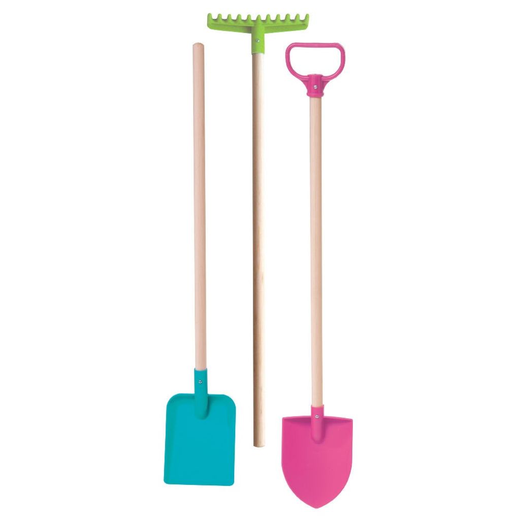 Ett plastset i 3-delar till den lilla trädgårdsmästaren bestående av kratta, spade och skyffel.