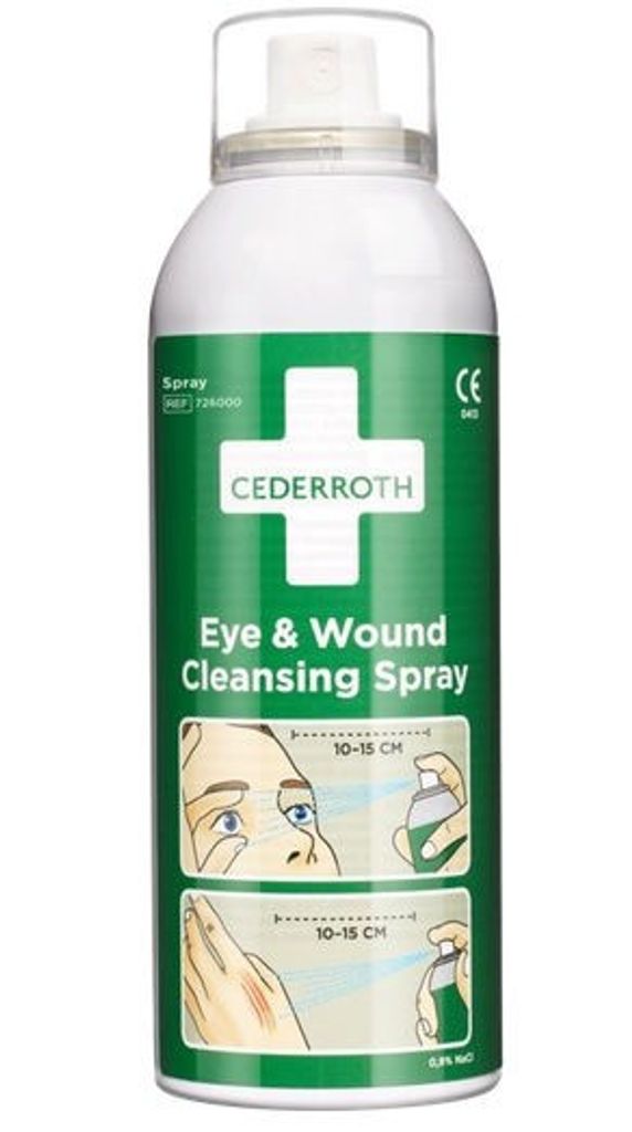 Cederroth spray för att rengöra och skölja bort damm och smuts ur ögon och sår. Sprayen ger ett mjukt vätskeflöde och har en total spoltid på 5 minuter. Sprayen kan användas flera gånger och är steril till sista droppen. Kan användas från alla riktningar.