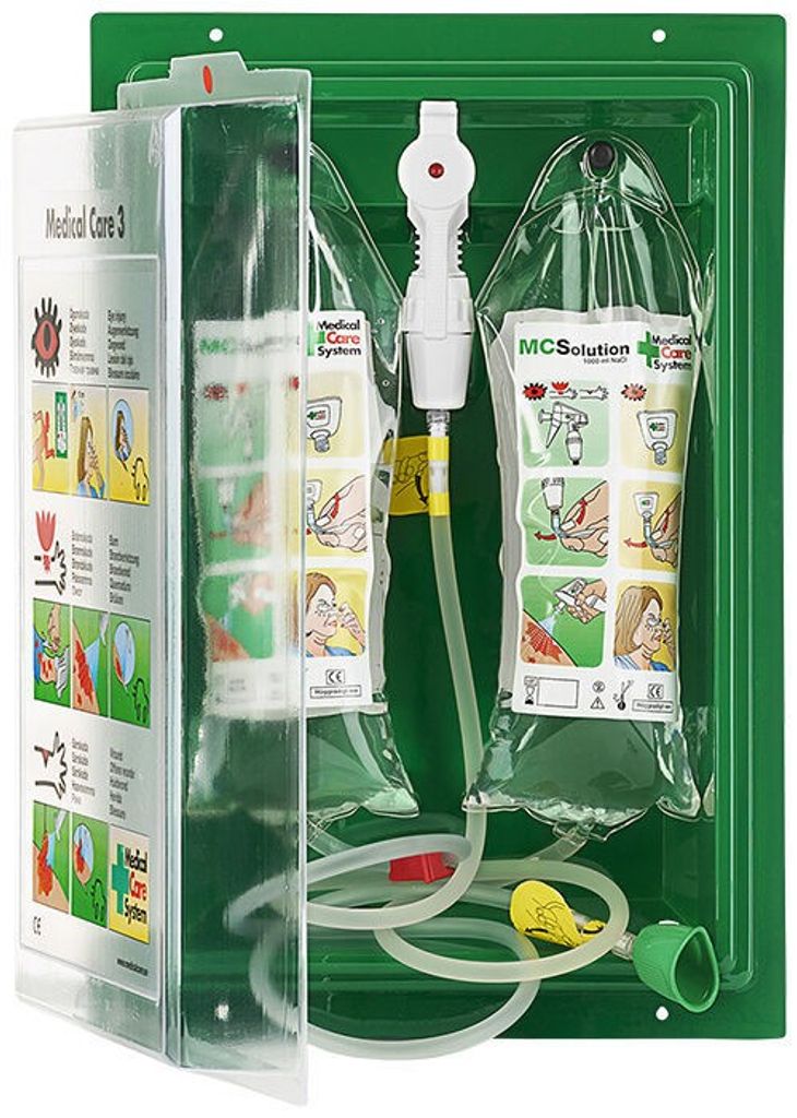 Skåp i plast med skyddslock. Innehållande utrustning för ögon-, bränn- och sårskadebehandling. Utrustningen lämpar sig även för behandling under transport.