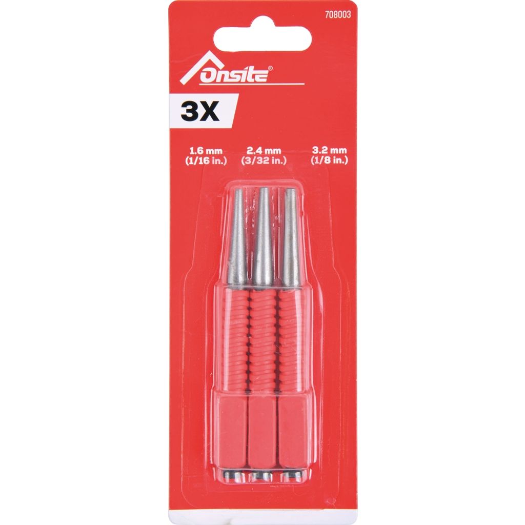 Onsite spikdrivarset innehåller tre spikdrivare i storlekarna 1,6 mm, 2,4 mm och 3,2 mm. Försedd med greppvänligt plasthandtag för säker och bekväm användning vid urdragning och försänkning av spik.