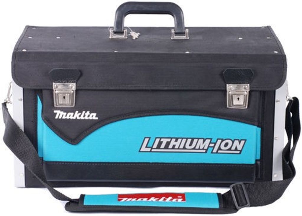 Kraftig och gedigen verktygsväska med bärrem och handtag.