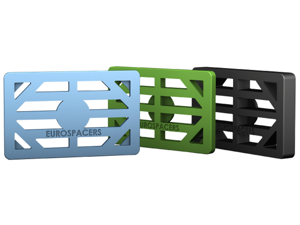 Eurospacers, För inpassning av olika typer av betongelement, fönster, trappor, grundbalkar, träreglar m.m. Högsta materialkvalité gör att de klarar maximal belastning. Brickorna kan staplas och hakar i varandra med piggar som passar motsvarande hål. Ej avsedda för permanent pallning av betongelement.