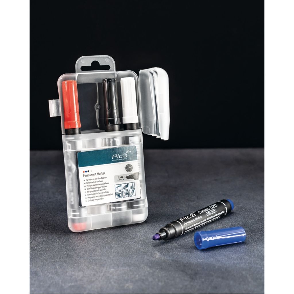 Pica Classic 534 är en permanent märkpenna med rund spets för precisa markeringar. Skrivbredd 1 mm ger skarpa linjer på både blanka och porösa ytor. Setet levereras i ask med fyra färger röd blå svart och vit. Snabbtorkande och slitstark samt fri från xylol och toluol för ett mer skonsamt arbetsflöde.