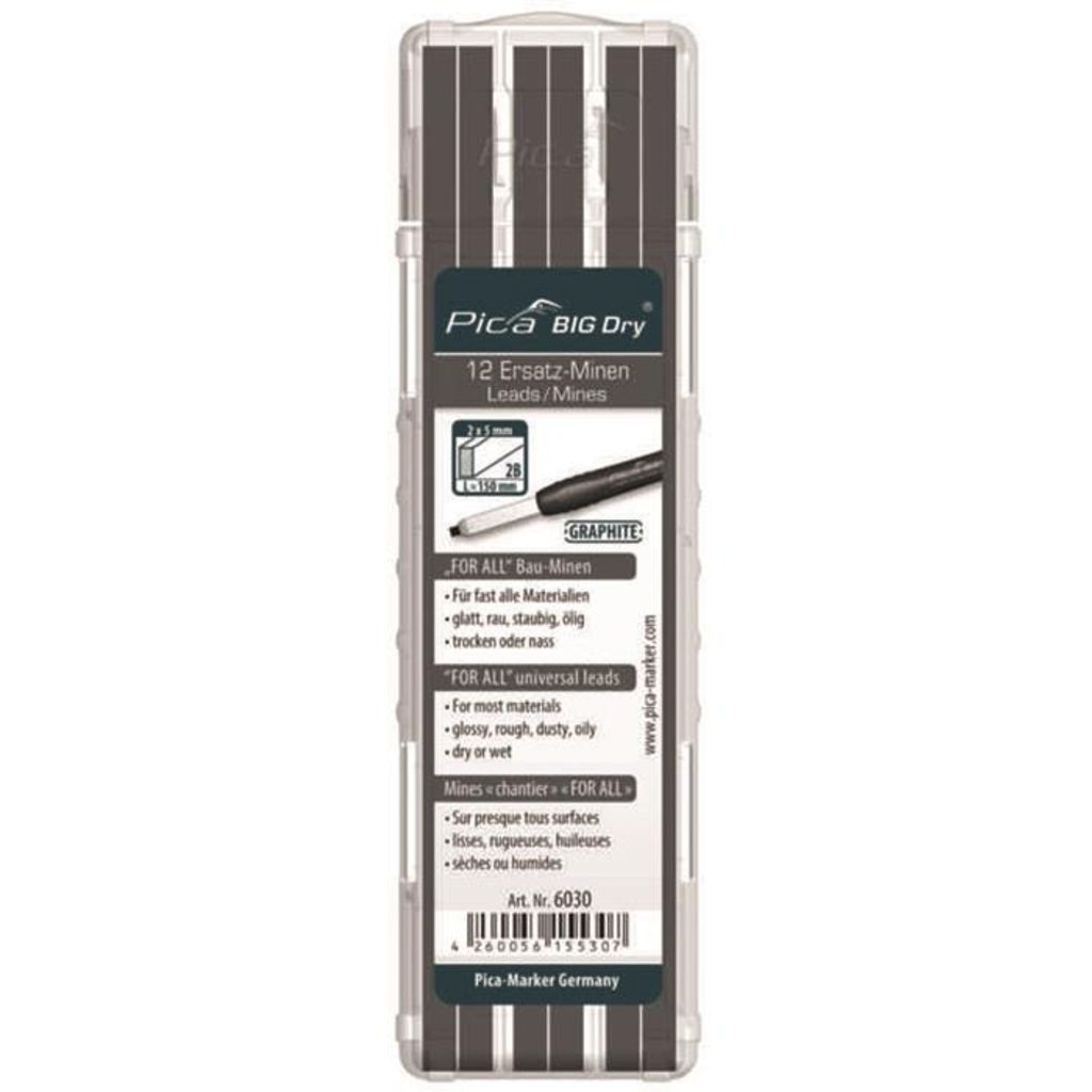 Pica 6030 Big Dry Refillpaket erbjuder en praktisk lösning för alla dina markörbehov. Denna förpackning innehåller 12 st grafitstift som är särskilt utformade för att fungera på en mängd olika material. De är vattenlösliga och kan användas även på smutsiga och oljiga ytor, vilket gör dem perfekta för både professionella hantverkare och hemmafixare.
