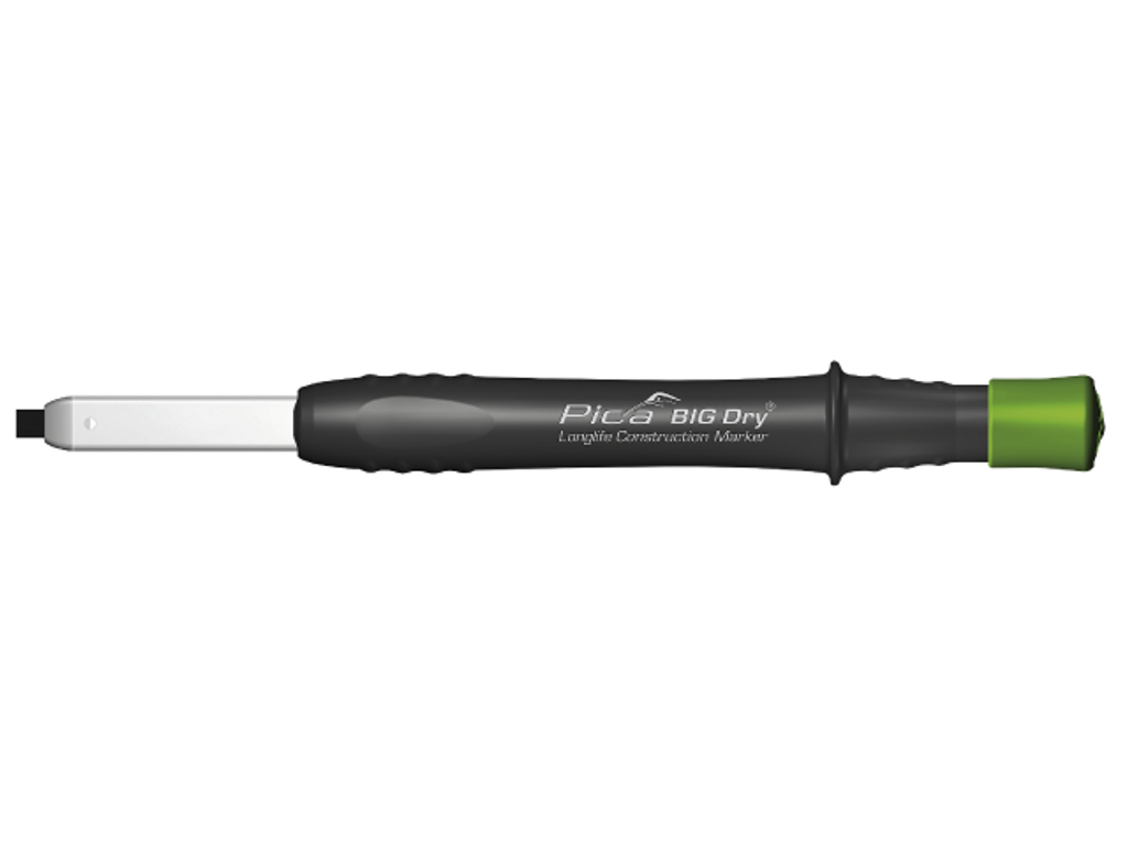 Pica Dry BIG Dry är en snickarpenna med ett 2 x 5 x 150 mm rektangulärt grafitstift. Kan användas på de flesta typer av material, även smutsiga och oljiga ytor. Stiftet kan bytas ut. Pennan levereras i ett hölster med kraftig clips för att sitta säkert i t.ex. byxfickan.