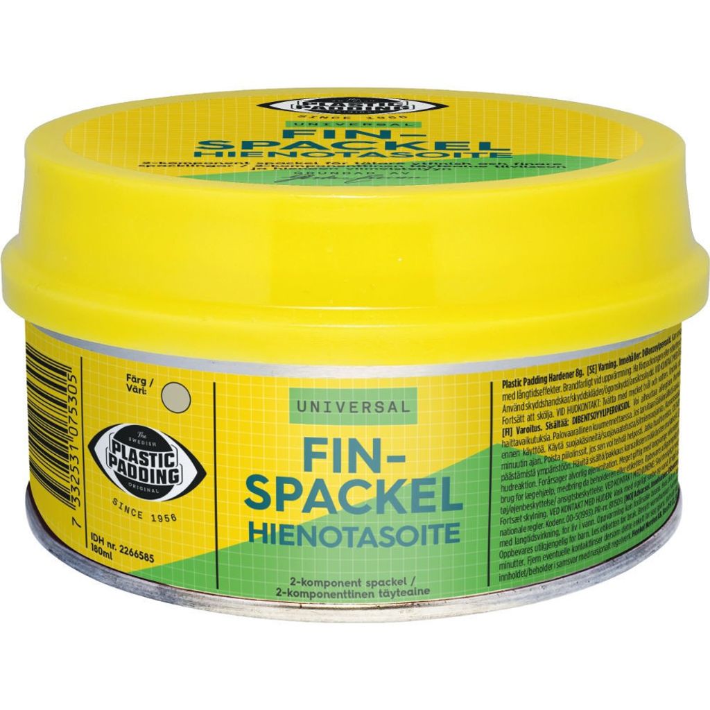 Plastic Padding Finspackel är en 2-komponents-polyesterspackel, extremt lättslipat och specialiserat för tätare ytfinish och finare spacklingar. Det är perfekt för att fylla små sprickor och bucklor orsakade av sten, och för ytor som behöver övermålas eller lackas. Det fungerar väl på metall och trä, och har en snabb härdningstid på 25–35 min vid 20°C. Produkten har en vit/ljusgrå färg och en hållbarhet på 2 år (oöppnad förpackning) vid lagring i +15–20°C.