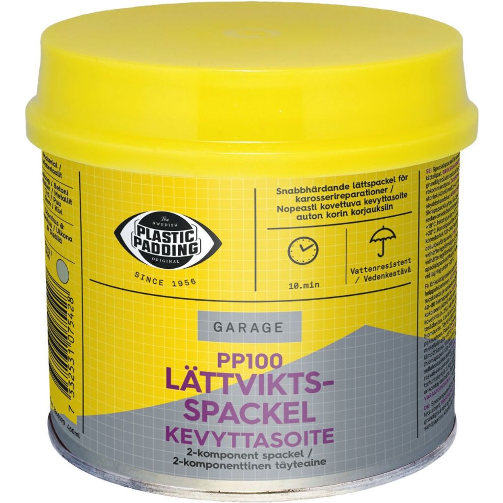 PP100 Lättviktsspackel från Plastic Padding är skapat för att ge en tät ytfinish och är därför utmärkt för lackeringsarbeten. Det är mycket lätt att slipa och är lämpligt för användning som bas, fyllmedel eller ytfinish på metaller, plåt och glasfiber. Härdningstiden varierar mellan 16-30 min vid 20°C. Används med skyddshandskar och skyddsglasögon, och rengöring av verktyg kan göras med etylacetat eller cellulosaförtunning.