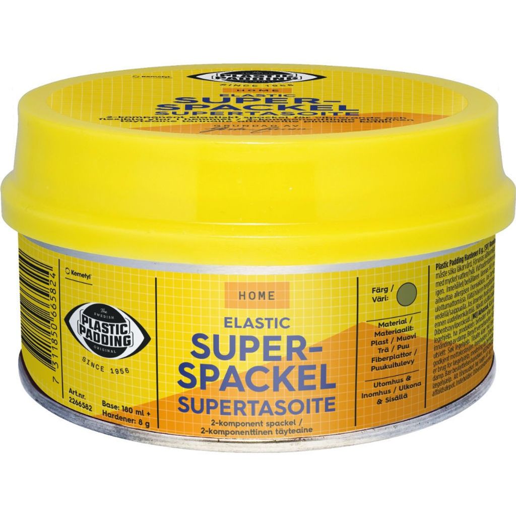 Elastic Superspackel från Plastic Padding är en elastisk 2-komponents lösning som är särskilt utformad för ytor som kan utsättas för rörelse och vibration, som trägolv. Det är också lämpligt för reparation av plastelement på bilens kaross. Spacklet är lättslipat och kan övermålas eller lackas. Det varken sjunker eller spricker och är lämpligt både för inomhus- och utomhusbruk.