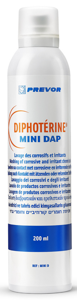 Steriliserad personlig spray för sköljning av ansikte, arm och hand. Diphoterine® är en neutraliserande sköljvätska för alla typer av kemiska angrepp, såväl på hud som i ögon.