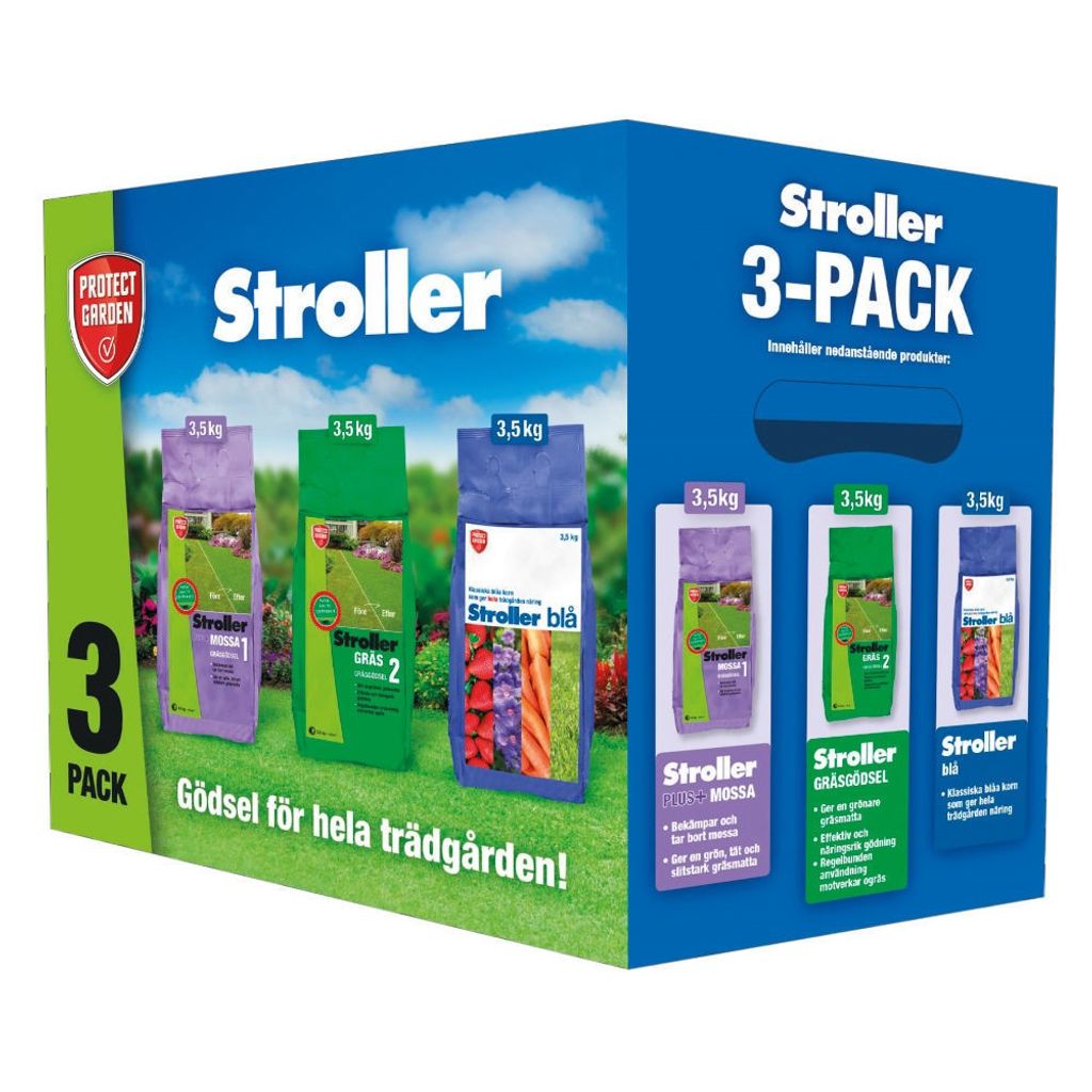 3-pack med gödning. Stroller Mossa och Stroller Gräs för gräsmattan. Stroller Blå för trädgårdens alla växter, frukt och grönsaker.Samgranulerad allround-gödning som passar lika bra för rabatten som för gräsmattan.