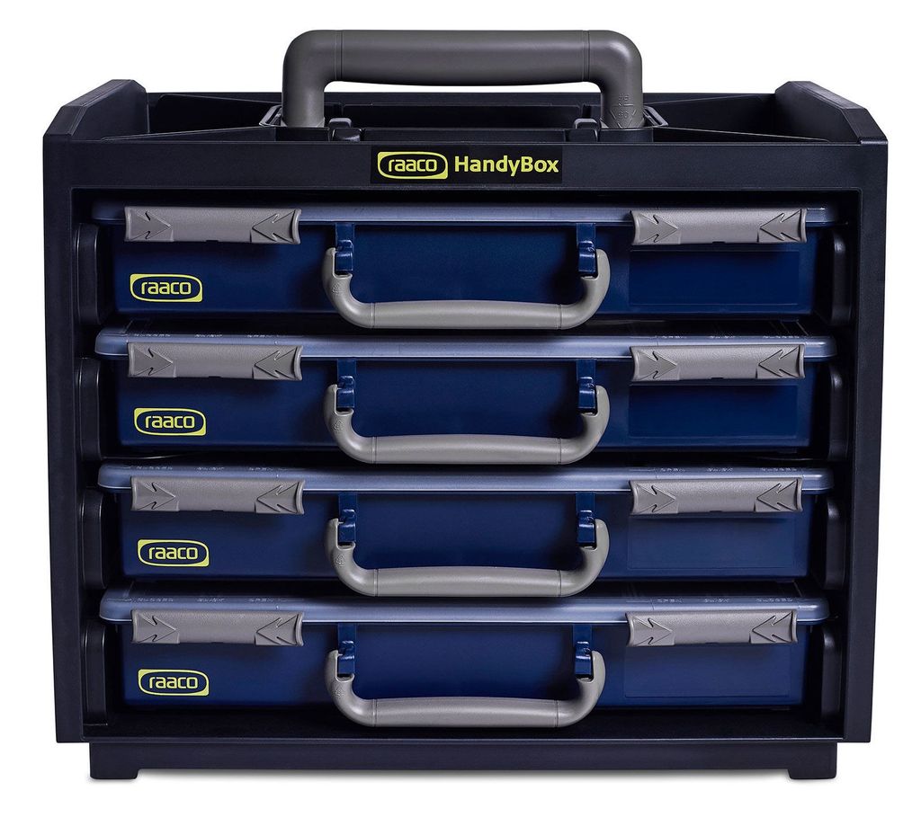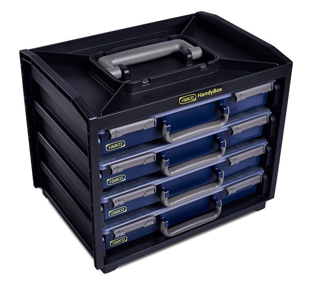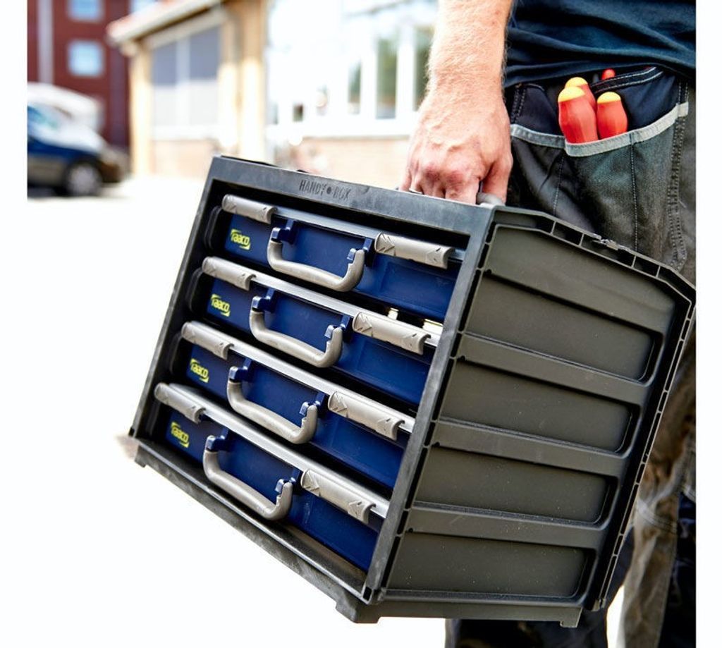 Med en höjd på 310 mm, en bredd på 376 mm och ett djup på 265 mm, erbjuder Raaco Handybox gott om utrymme samtidigt som den är kompakt nog för enkel förvaring och transport. Det inbyggda bärhandtaget gör det enkelt att ta med boxen till och från arbetsplatsen, och dess låssystem säkerställer att alla väskor hålls på plats under transport.