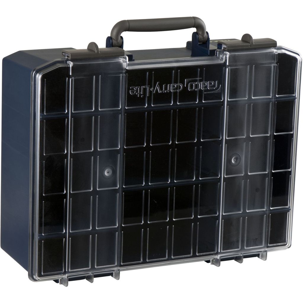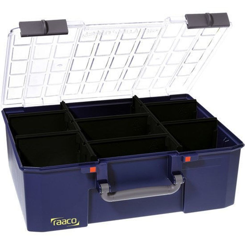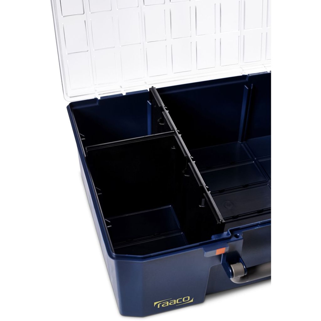 Lockets fyra gångjärn och två skjutlås garanterar att väskan håller sig stängd och innehållet säkert på plats. Det glasklara polykarbonatlocket ger en tydlig översikt över innehållet utan att behöva öppna väskan, vilket sparar tid och gör det enkelt att hitta det du behöver. Det praktiska bärhandtaget gör väskan lätt att transportera, och de lösa skiljeväggarna gör att du kan anpassa inredningen efter dina specifika behov.