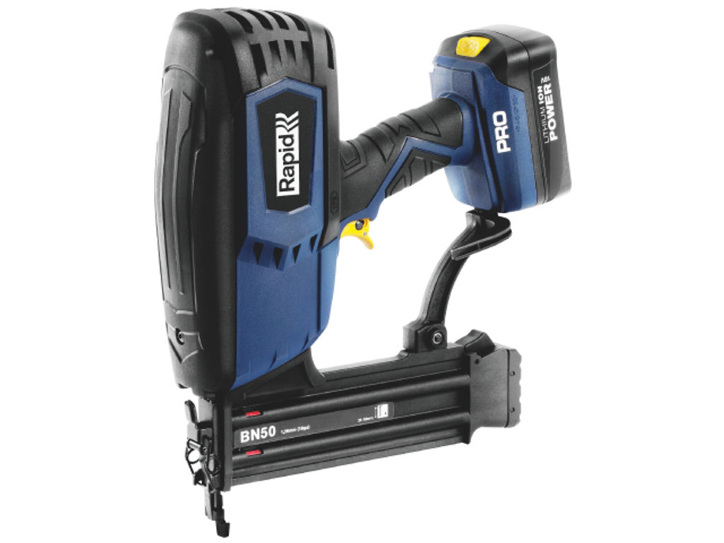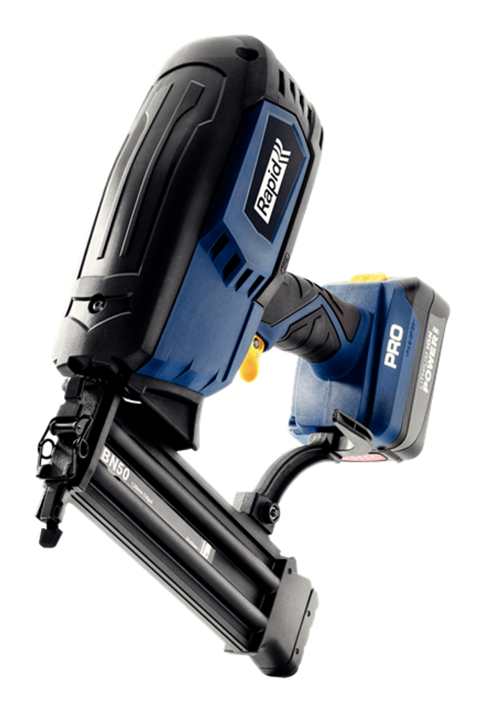 Rapid Dyckertpistol Batteri BN50 är en kraftfull och professionell batteridriven dyckertpistol för 1,2 mm dyckert (18 Ga). Lämplig för att sätta lister och panel. Med ett 18V Li-Ion batteri öppnas nya möjligheter av mobilitet utan att göra avkall på kraft. BN50 är nästan helt underhållsfri och tystgående till skillnad från marknadens gaspistoler med likvärdig prestanda. Du slipper oljud och oangenäma gasdofter och den är betydligt enklare och billigare att underhålla än en gaspistol. Magasinet öppnas via en knapptryckning vilket gör att det går enkelt och snabbt att ladda. BN50 drivs av ett effektivt svänghjul för maximal kraft och pålitlighet. Avfyrningsresponsen är omedelbar vilket effektiviserar arbetstiden och för att inte riskera säkerheten sker avfyrningen först efter att nosspärren har tryckts ner vilket även förhindrar risk för dubbelspikning. För 1,2 mm (18 Ga) dyckert No. 8, 25-50 mm. Snabbladdning av dyckert genom magasin som öppnas via enkel knapptryckning. 18 V Li-Ion batteri (2 st x 2 Ah inkluderat). Mer än 500 avfyrningar per laddning. Omedelbar avfyrningsrespons som effektiviserararbetstiden.