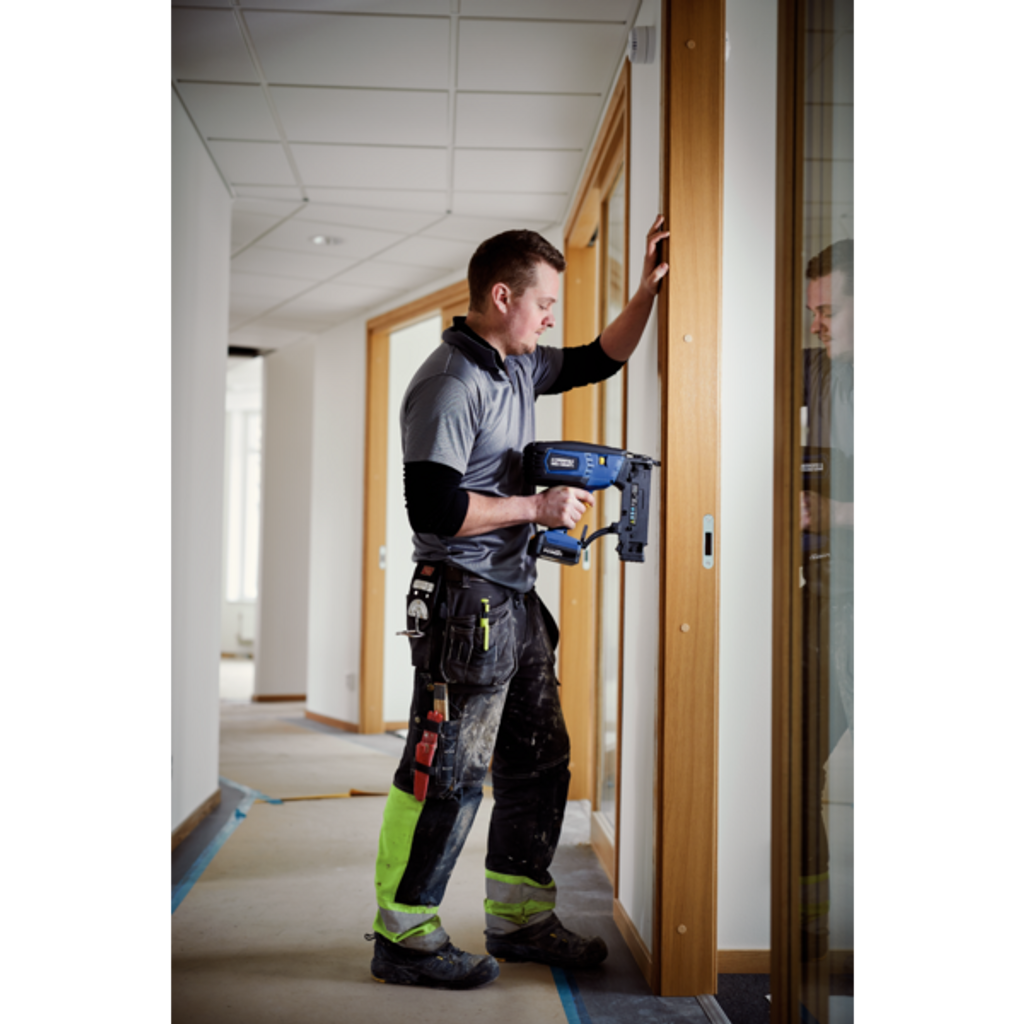 Sekventiell avfyrning i 2 steg för säker hantering. Verktygsfri spikdjupsjustering. Snabb-laddare inkluderad - 45 min att ladda 80 % av batteriet. LED indikerar hur mycket laddning som finns kvar.
