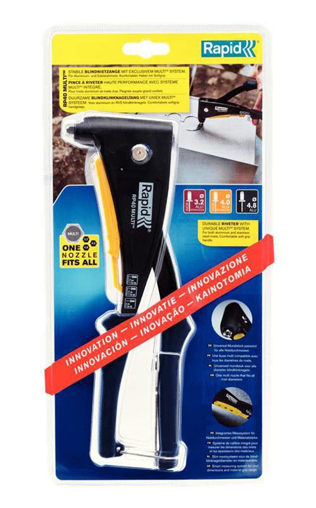 Rapid RP40 MULTI är en revolutionerande blindnitverktyg utrustad med ett smart kontrollsystem och integrerat skjutmått för perfekt nitanvändning. Detta verktyg garanterar användning av rätt blindnit i rätt hål med sitt unika multi-munstycke, som accepterar storlekar 3,2 - 4,8 mm i både aluminium och rostfritt stål, utan behov av munstyckesbyte. Vikt: 0.54 kg.