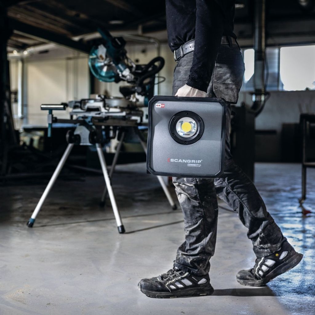 Scangrip Nova 10 Connect arbetsbelysning med en kraftfull 10000 lumen strålkastare. Kompatibel med METABO/CAS batterisystem 12V 4,0 Ah - 18V 5,2 Ah och alla andra 18V batterier från ledande elverktygsmärken genom att använda Scangrip Connector.