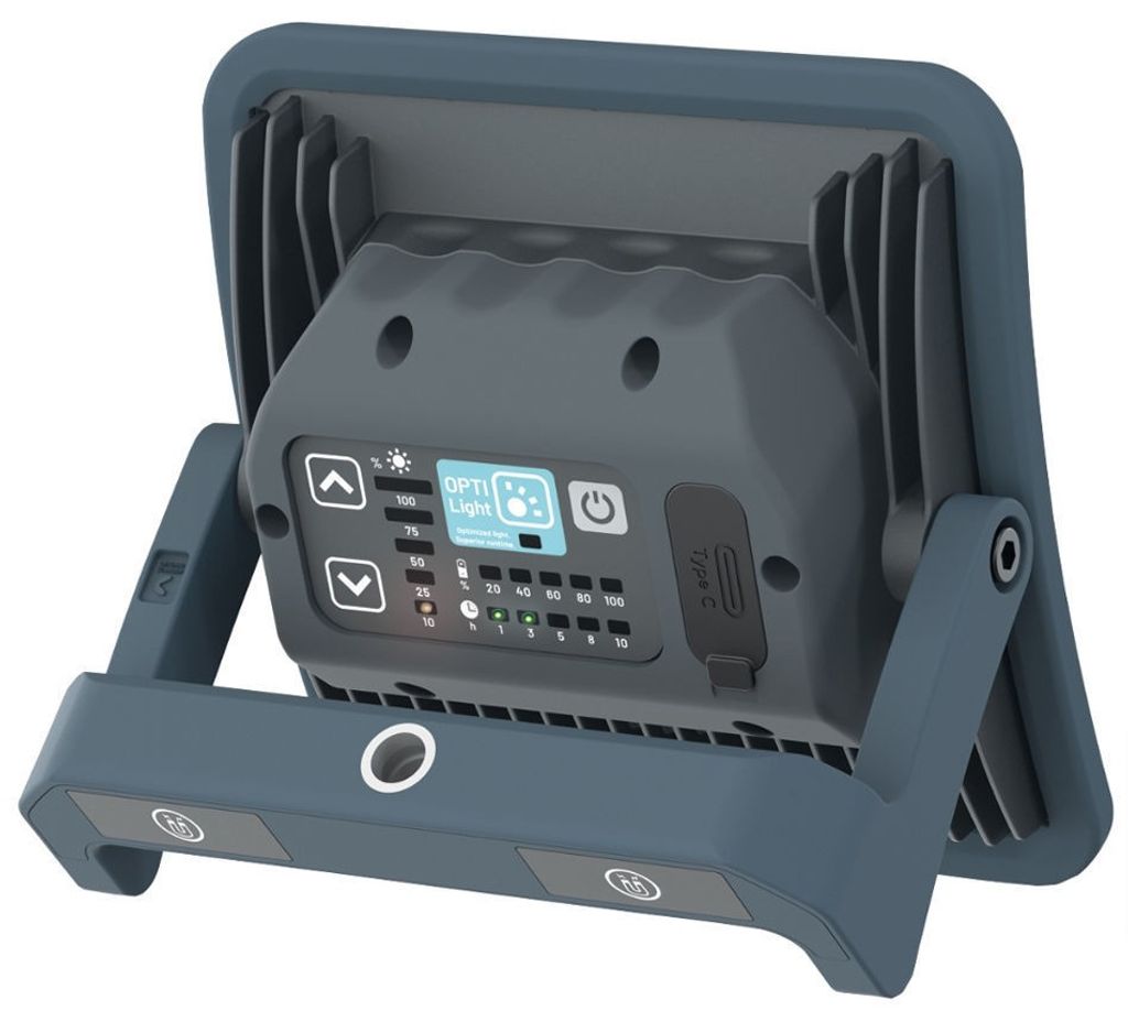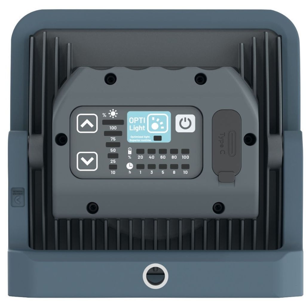 Arbetslampan har en OPTILight-inställning som säkerställer optimalt ljus och lång batteritid. Den uppladdningsbara designen, i kombination med den inbyggda Powerbank-funktionen, gör det möjligt att ladda mobila enheter vid behov. Dessutom visar den intelligenta batteriindikatorn tydligt den återstående batteritiden.