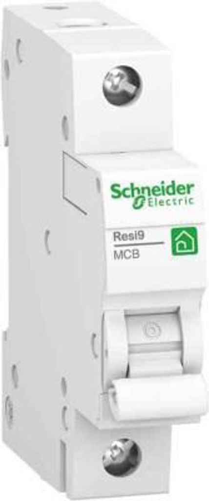 Schneider Electric Resi9 automatsäkring är en 1-polig dvärgbrytare för bostadsinstallationer och små kommersiella byggnader med en C-karaktäristik och en märkkortslutningsförmåga på 6 kA.