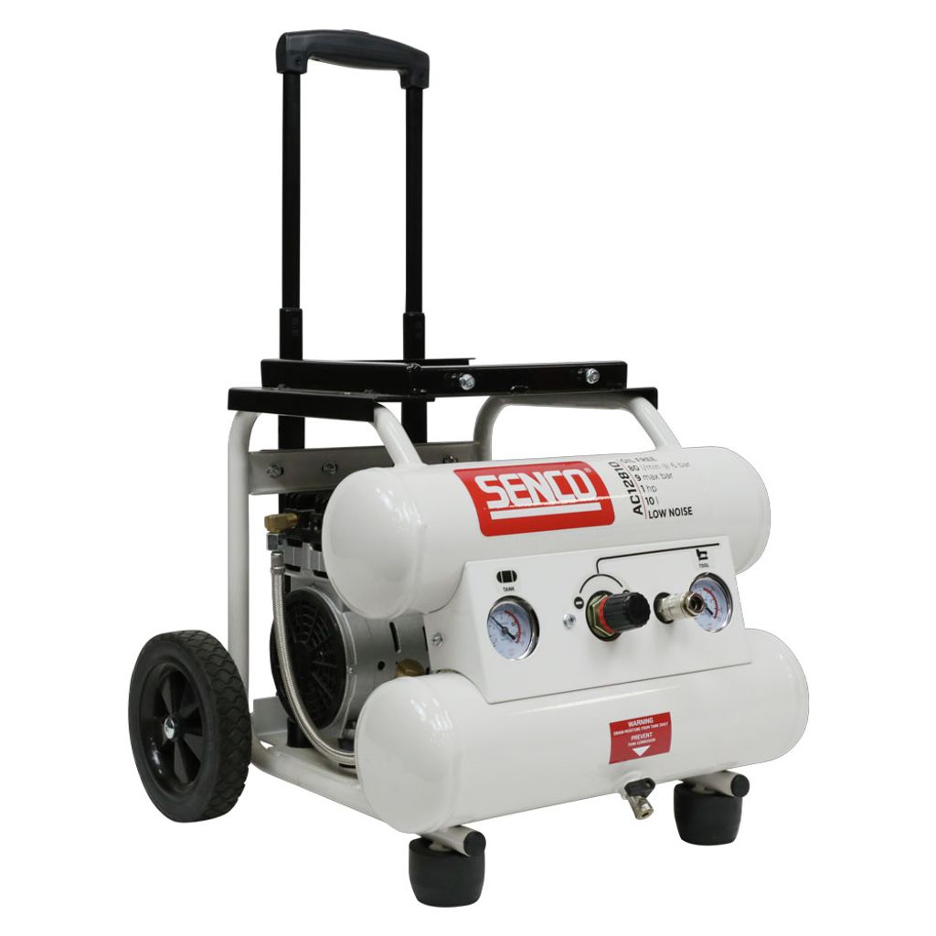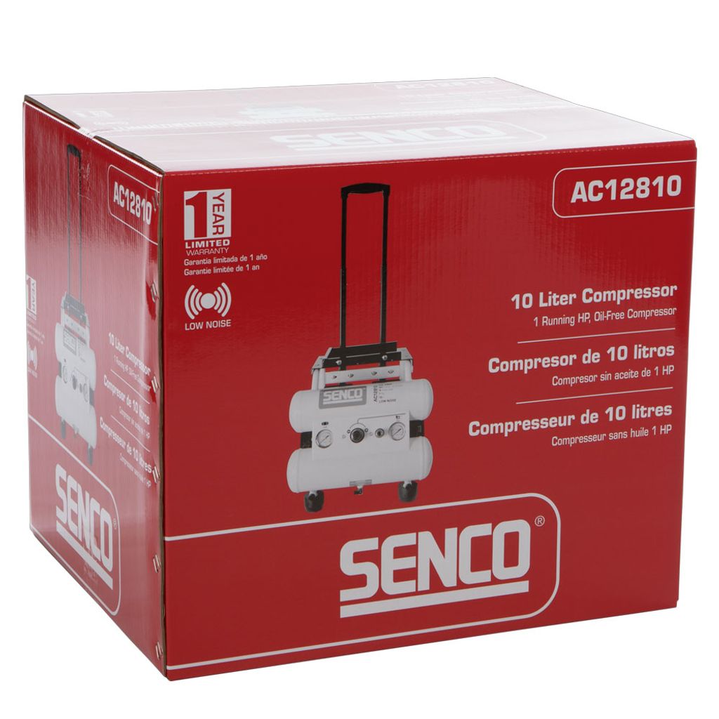 Senco AC12810 är en kompakt och mobil low noise kompressor för arbetsplatser där låg ljudnivå är avgörande. Den oljefria tekniken och ljudnivån på endast 65 dB gör att du kan placera kompressorn direkt vid arbetsstationen utan att störa användaren. Utdragbart handtag, två hjul och två sugfötter ger enkel förflyttning och stabilitet. Universal tryckluftskoppling för snabb anslutning.