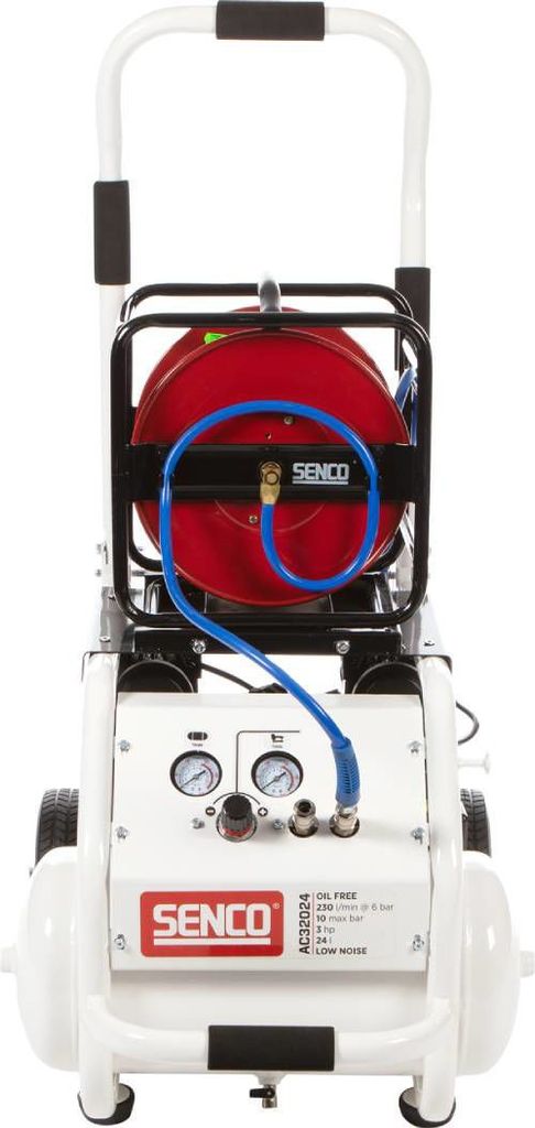 Senco AC32024 är en 10-bar kompressor med låg bullernivå och utrustad med 3 HP-motor. Den har en 24 liters tank och en plattform för monteringad av SENCOs slangvinda.