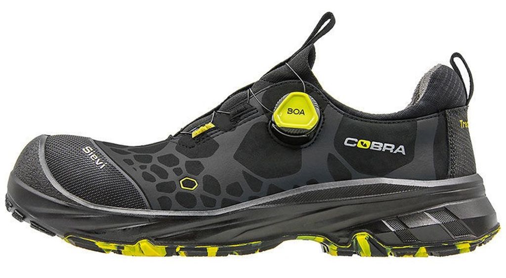 Sievi Cobra 2 Roller+ S3 är en modern skyddssko med en strumpliknande konstruktion för optimal komfort. Den innovativa sidoplacerade snörningsmekanismen, BOA® Fit System, gör den enkel att justera och sätta på. Skon har en friktionssula, Sievi TractionPro®, som garanterar utmärkt grepp och slittålighet. Dess sportiga profil ger stöd till fotens viktigaste stödområden. Skon innehåller även FlexEnergy®-elementet, som absorberar och återger över 55% av rörelseenergin till varje steg.