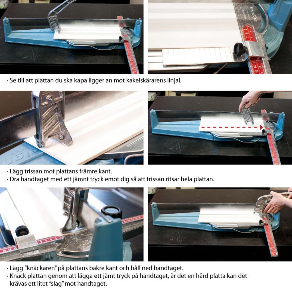 Kakelskärare med pull-funktion används genom att skärtrissan dras emot användaren och ritsar plattan. Därefter knäcks plattan.