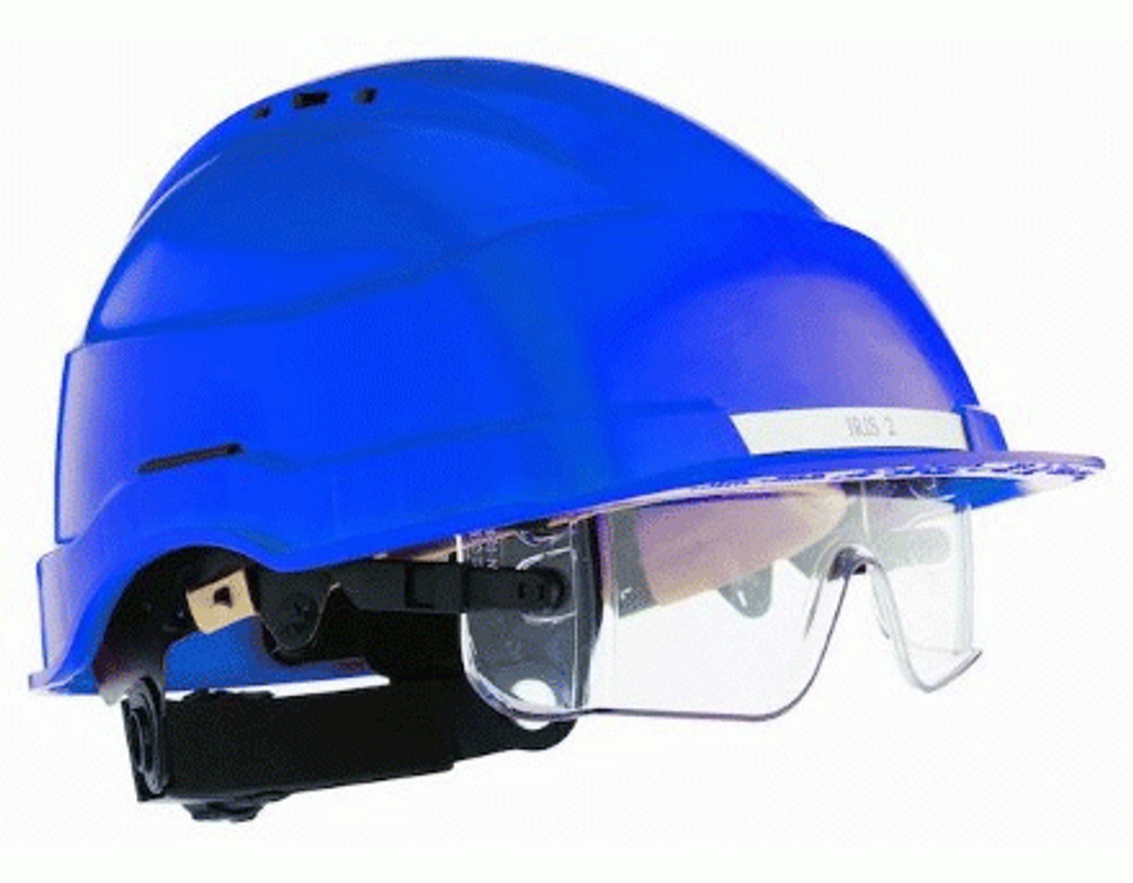 Skyddshjälm Iris II med visir. En rymlig och stor hjälm med plats för stora skyddsglasögon som kan sättas utanpå de egna glasögonen.