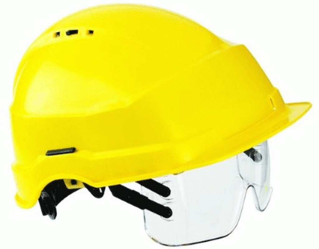 Skyddshjälm Iris II med visir. En rymlig och stor hjälm med plats för stora skyddsglasögon som kan sättas utanpå de egna glasögonen.