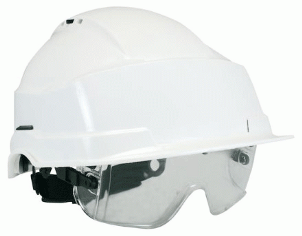 Skyddshjälm Iris II med visir. En rymlig och stor hjälm med plats för stora skyddsglasögon som kan sättas utanpå de egna glasögonen.