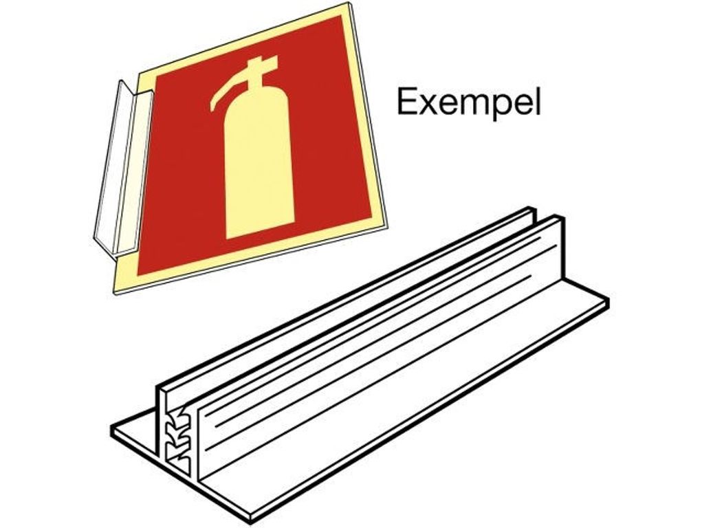 Skyltgrepp med dubbelhäftande tejp för montage mot tak eller vägg. Skyltar med djup 0,5-2 mm passar i fästet. Slitstark plast