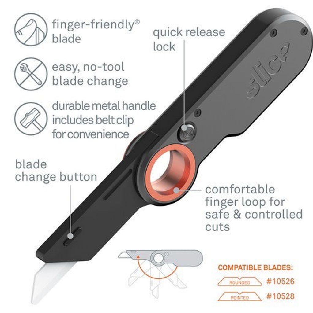 Slice Fällbar Keramisk Säkerhetskniv är en fällbar keramisk säkerhetskniv. Kniven förhindrar olycklinga skärsår och knivbladet varar upp till 11 gånger längre än vanliga stålblad, passar in i din jacka eller byxficka och har också ett praktiskt bältesklämma så att du alltid har den till hands. Den integrerade fingerringen säkerställer ett säkert grepp. Som alla Slice-verktyg kan 10562 användas av både höger- och vänsterhandlare. Alla skivsäkerhetsblad är icke-gnistrande, icke ledande och rostar inte.
