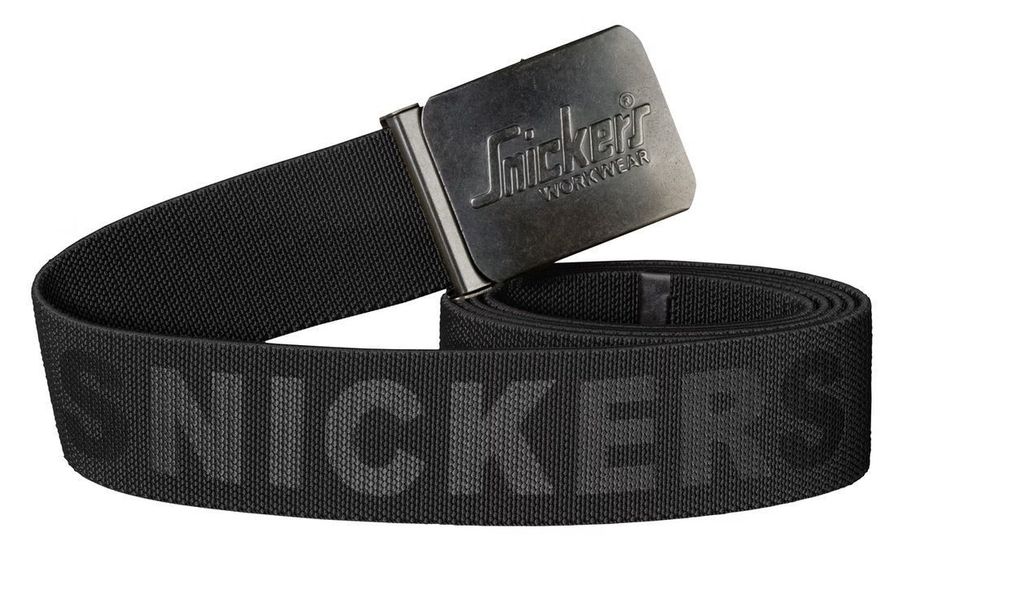 Bälte från Snickers med logo tryckt längs med är i One-size är svart i grunden med "Snickers Workwear" tryckt i grått. Ett elastiskt och tåligt bälte av 95 % polyester och 5 % elastan, med antiksilverspänne med Snickers logga inpräglat.