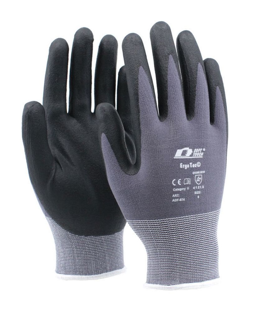 Soft Touch® Ergo Tec ADF-874 är en stickad handske i nylon/lycra och som är doppad i innerhanden. Doppningen består av en blandning av PU och nitril. Handsken ger mycket bra grepp och kan med fördel användas för alla typer av precisionsarbeten.Handsken är Silikonfri, fri från lösningsmedel och ger inga fingeravtryck.