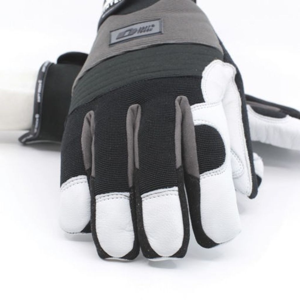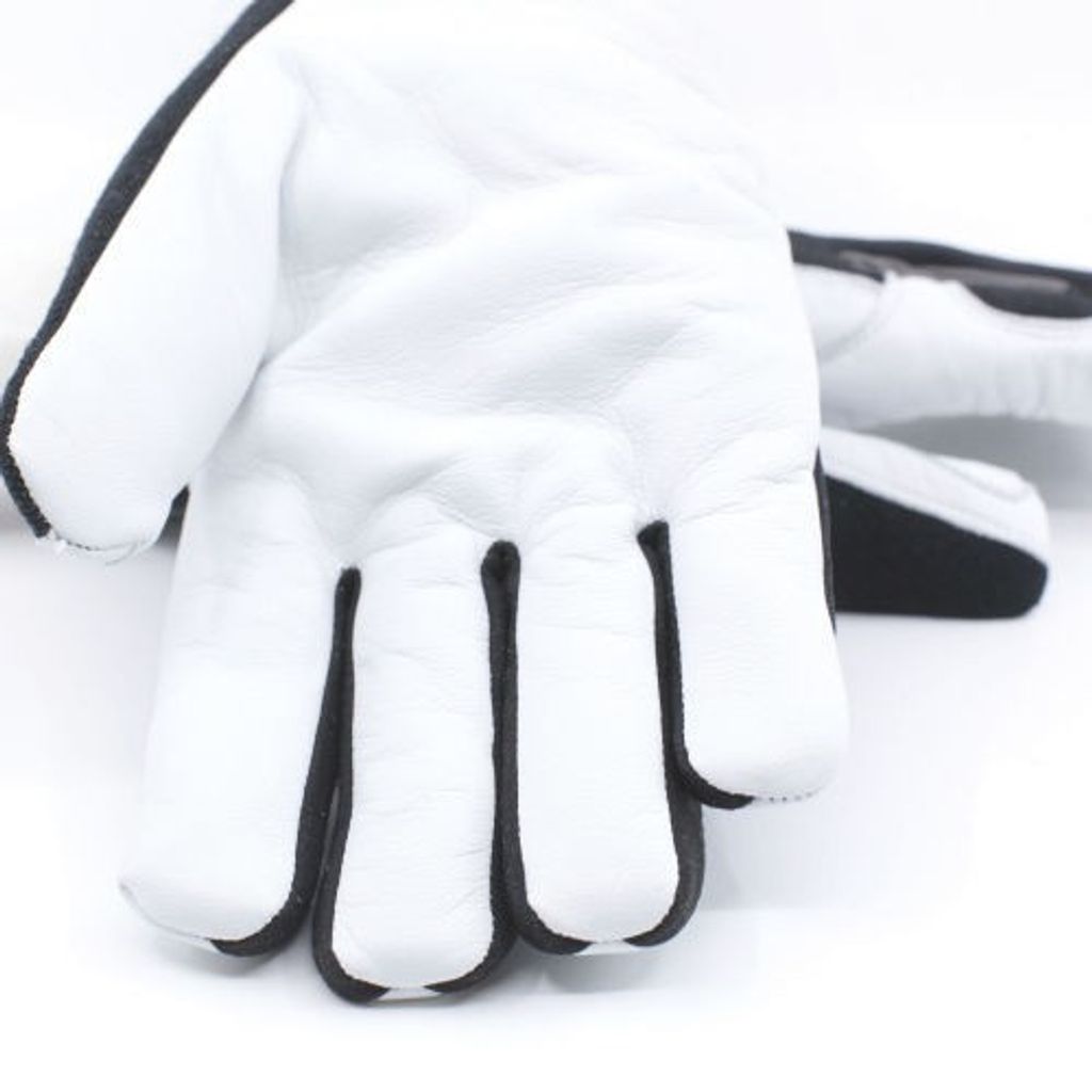 Handskarna är sydda i getskinn i innerhanden och fodrad med fleecefoder. Ovanhanden i spandex och med knogförstärkning i neopren. Mudden är i neopren.