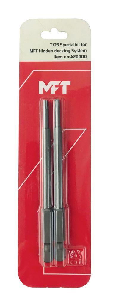 MFT TX15 specialbits för dolt montage av trallskruv. Bitset har en special form för att passa tillsammans med MFT monteringsverktyg och att ett korrekt monteringsdjup på skruven uppnås.