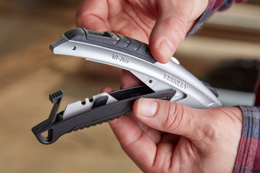 Stanley Typ DynaGrip. Ergonomiskt utformat handtag av aluminium med mjuka greppsidor. Kniven är försedd med funktion för snabbt bladbyte utan behov av verktyg. Magasin för knivblad i handtaget. Knivens utformning ger god komfort, kontroll och balans. Försett med öppning till knivbladet för att lätt skära av snören.