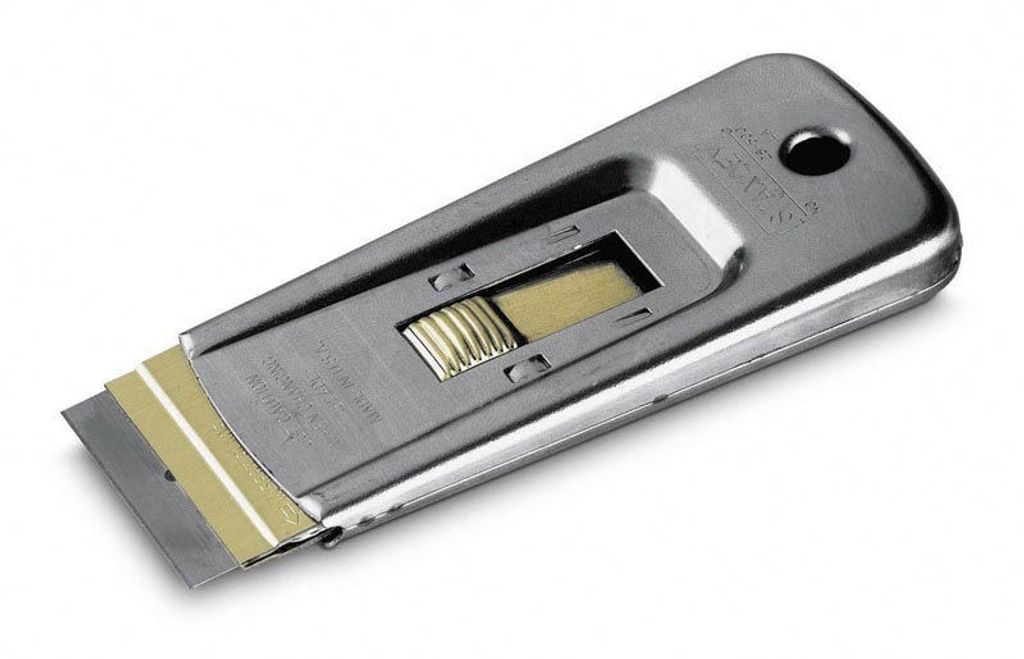 Stanley 0-28-500 Fönster-/Glasskrapa av hög professionell kvalité. Glasskrapan har ett indragbart rektangulärt blad och en tryckknapp i mässing. Glas-/Fönsterskrapan är perfekt för att skrapa bort målarfärg, lim eller dylika material.