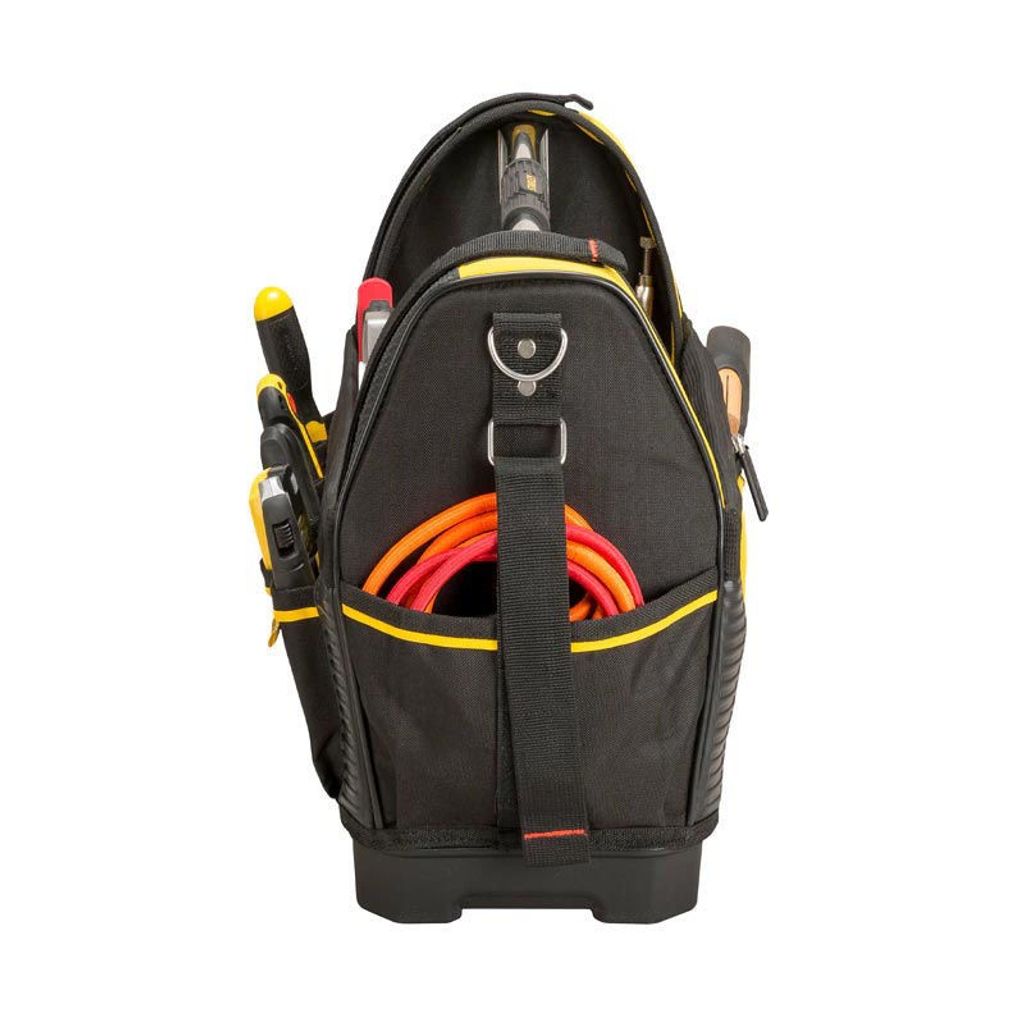 Stanley FatMax 1-93-951 är en öppen verktygsväska som kombinerar robust 600 deniers tyg med läderförstärkningar och vattentät botten. Ballistiskt sågfack med kardborre ger säker förvaring och elastiska öglor samt många fack håller verktygen organiserade. Ergonomiskt handtag och axelrem gör väskan bekväm att bära även fullastad upp till 20 kg.