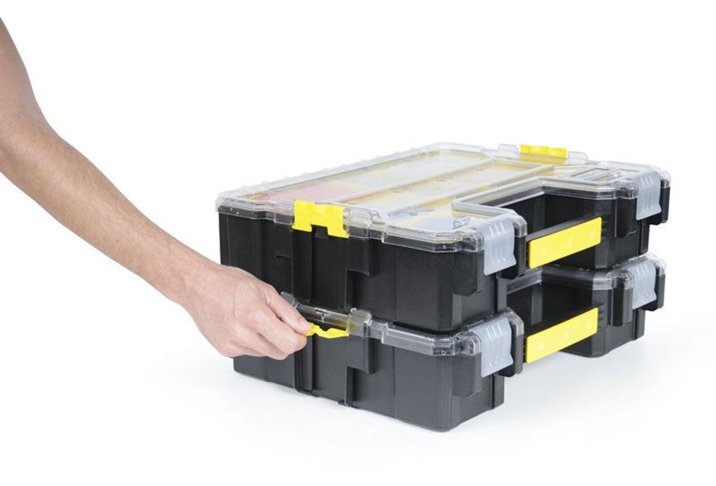 Vattenresistent sortimentlåda med löstagbara fack och lådor för smådelar och tillbehör.