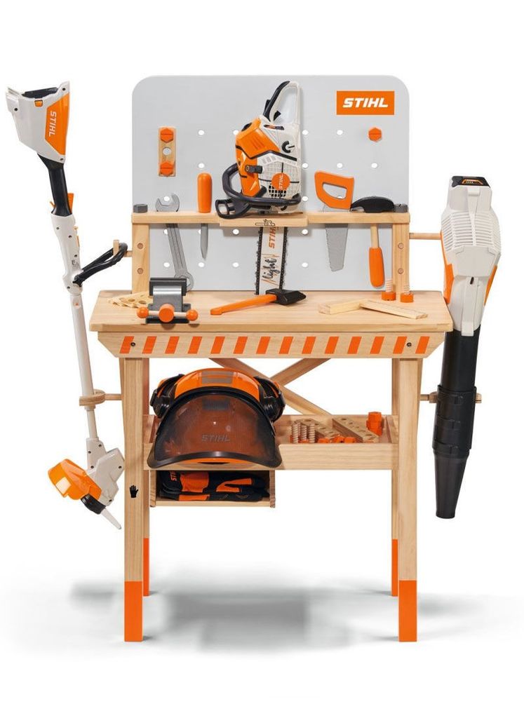 STIHL arbetsbänk för barn är perfekt för små byggare och trädgårdsmästare som vill utforska hantverksarbete genom lek. Med sina hållare för barnmaskiner och en stor arbetsyta är den idealisk för att skapa och bygga på ett säkert och kreativt sätt. Passar barn från 3 år och uppåt.