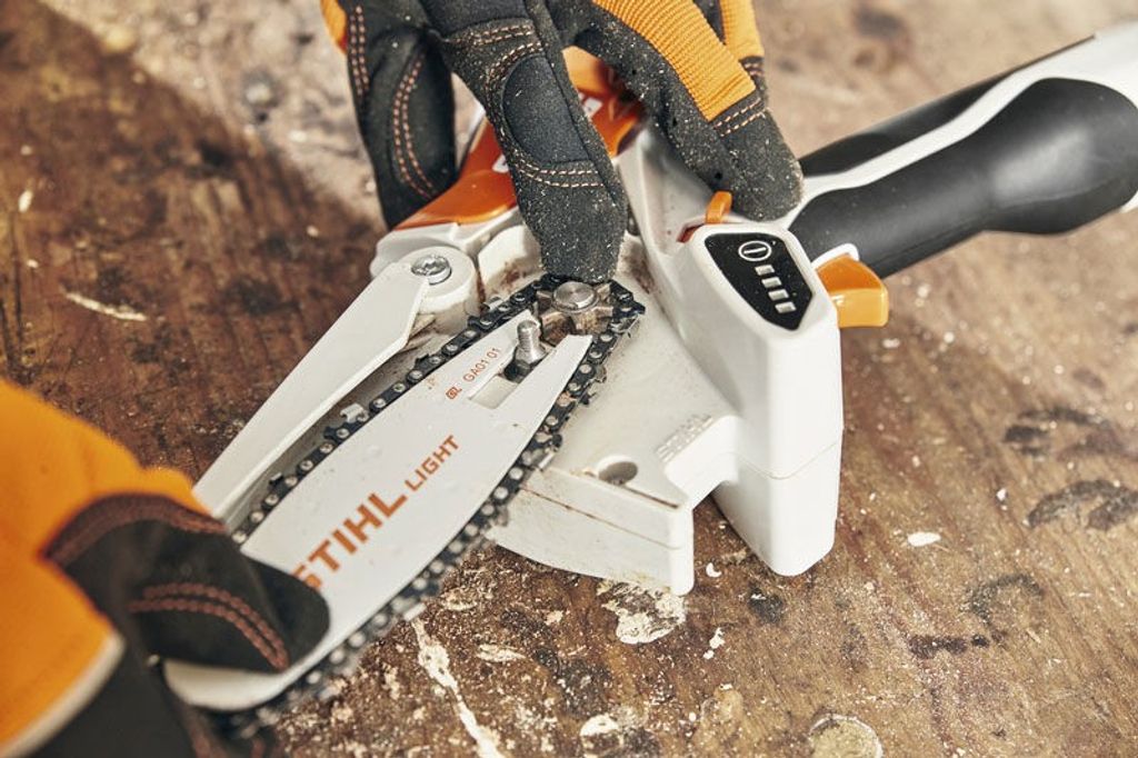 Utrustad med en 1/4" PM3 sågkedja som ger en mycket bra skäreffekt och mycket kraft. Antihalkbeläggning på handtaget och mycket bra ergonomi. Kedjan byts helt utan verktyg och är försedd med ett stort skydd för säkert arbete. Med inbyggd batteriindikator.