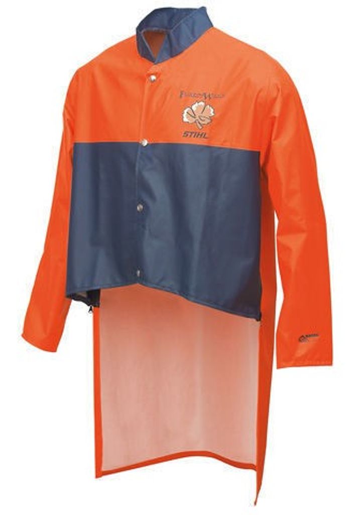 Stihl regnjacka ryggskydd - specialutvecklat, praktiskt regnskydd i orange med marinblå magparti. Långt ryggparti och kort framstycke. Liten stående rundkrage i halsringningen. Jackan knäpps framtill med kraftiga tryckknappar.