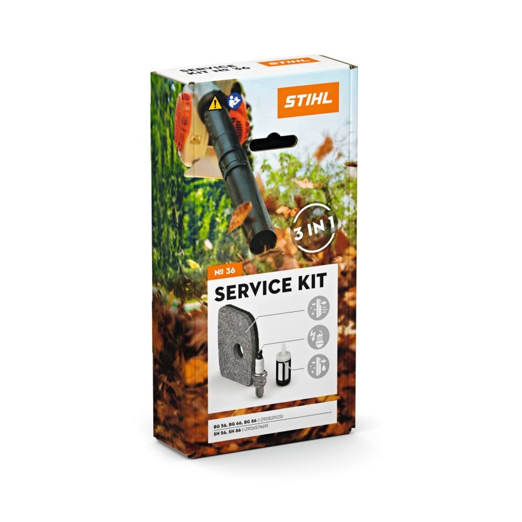 STIHL Service Kit 36 till BG SH 56 och BG SH 86 t.o.m. 2012 ger snabbt och förebyggande underhåll för hög driftsäkerhet. Kitet innehåller luftfilter i flies tändstift och bränslefilter samt kartongkrok i förpackningen. Passar BG 56 BG 66 BG 86 serienummer större än 290821925 och SH 56 SH 86 serienummer större än 290657469. Byt enkelt med maskinens kombinyckel